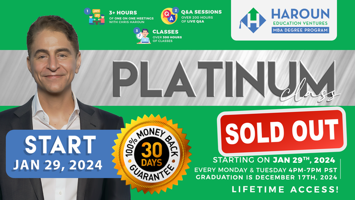 Are you ready to take your career to the next level? The Haroun Education Ventures MBA Degree Program® contains much more than 300 hours of videos (not including electives) plus 200 hours of live Q&A all taught by Chris Haroun to help you take your career to the next level! Chris Haroun has spent more than $1,000,000 creating the Haroun Education Ventures MBA Degree Program.