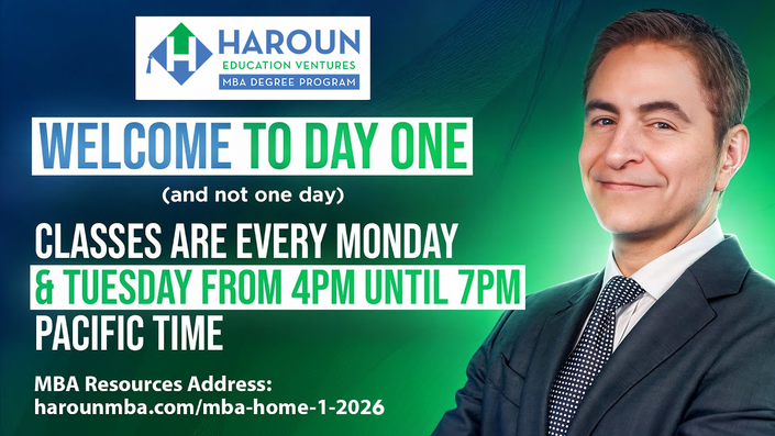 Are you ready to take your career to the next level? The Haroun Education Ventures MBA Degree Program® contains much more than 400 hours of videos (not including electives) plus 200 hours of live Q&A all taught by Chris Haroun to help you take your career to the next level! Chris Haroun has spent more than $1,000,000 creating the Haroun Education Ventures MBA Degree Program.