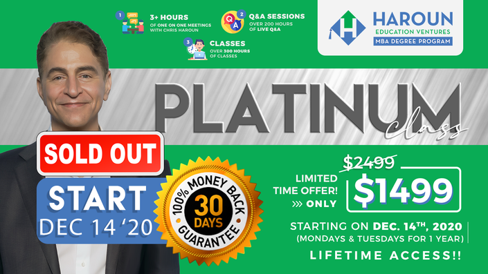 3+ hours of one on one meetings with Chris Haroun +over 500 hours: includes over 300 hours of classes and over 200 hours of live Q and A! 30 Day 100% $ Back Guarantee
